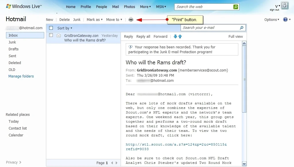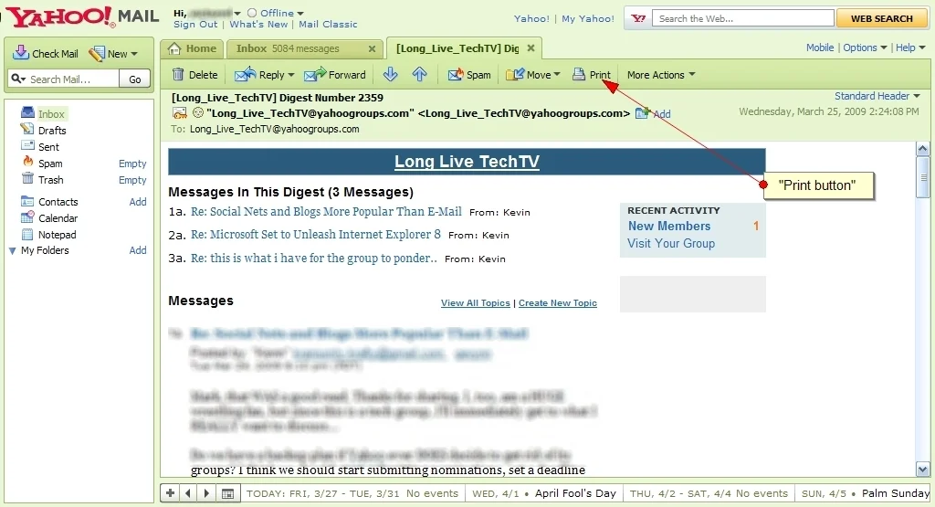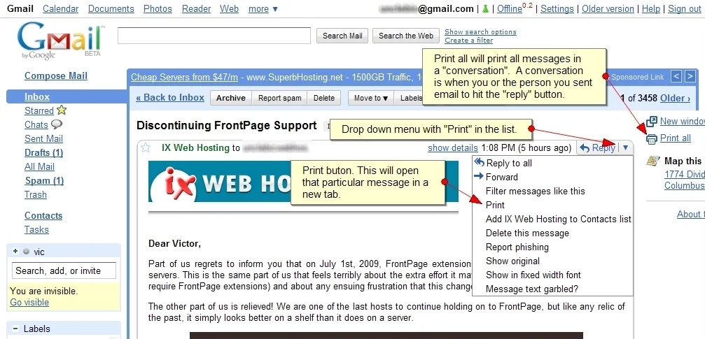 You may have noticed that when you try to print your email the printing comes out too small or not just the message like you want. Most of the online email services have started printing a little differently than most programs do. Once you open an email there is a button on the page that you need to use to print. On Yahoo mail and Hotmail there is a button above the list of messages or if you double click to open a message it will be above the message itself. On Gmail it is in the drop down to the top right of the message. This print button will open a new message window or tab that re-formats the message and the printing should match what you see on screen. This is a very common practice because so many pages have ads in them that you may not want to print. Even my own www.viclovan.com prints differently than what you see on screen! Hopefully this will help in printing your email.
